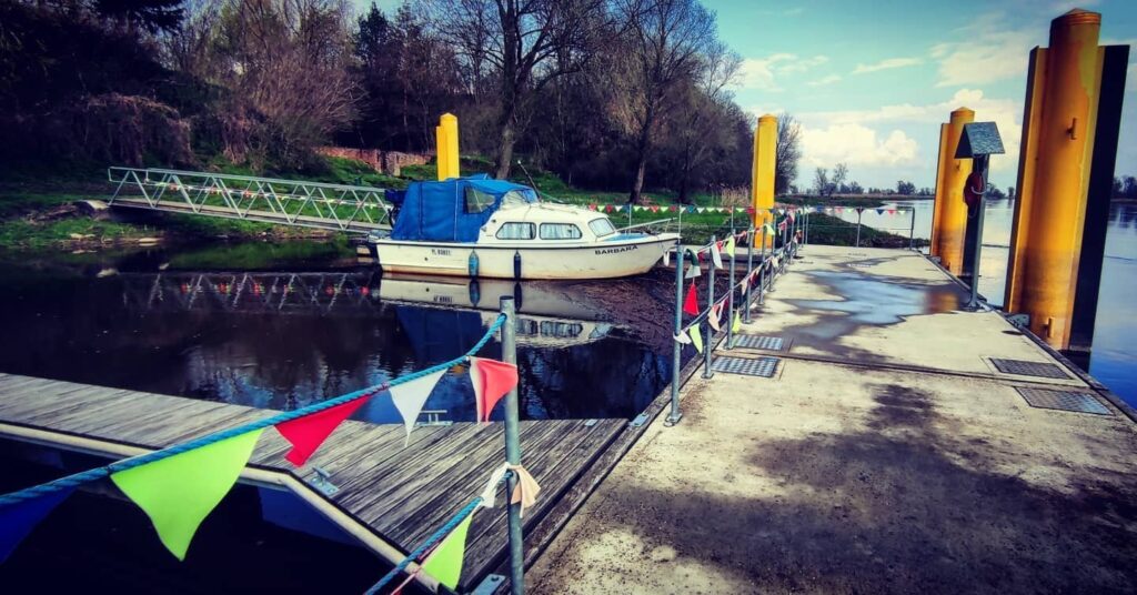 332 LB Ścinawa. Port w Ścinawie jest zwykle płytki i infrastruktura jest obecnie podstawowa. Spędziłem w Ścinawie przymusowe 3 dni postoju z powodu bardzo niskiego stanu wody więc gruntownie poznałem okolicę. Wojna pozostawiła po sobie takie zniszczenia, że w miejscu gdzie uchował się średniowieczny układ ulic i ich bez wątpienia stare nazwy – Franciszkańska, Bonifracka itp – nie ma po ówczesnych zabudowaniach jakiegokolwiek śladu, stoi tam osiedle domów jednorodzinnych. W ładną pogodę fajne poleżeć na kocu na polderze nieco w dół rzeki, zwłaszcza jak nie ma wody 🙂
